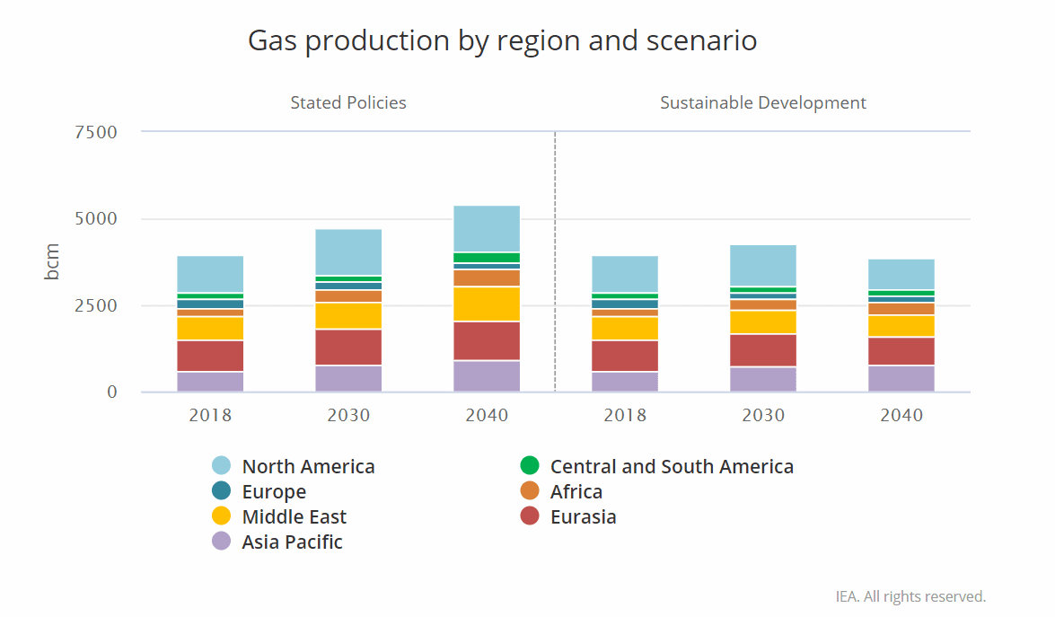 Globální poptávka po zemním plynu ovšem v tomto scénáři poroste a v roce 2040 dosáhne 5,4 bilionů metrů krychlových plynu. Růst poptávky v USA vyváží výše zmiňovaný pokles v EU.
