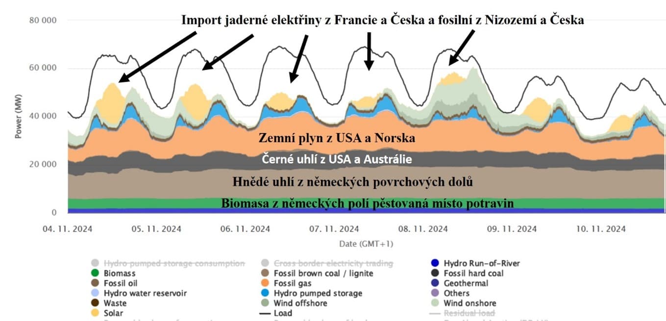 Německo pomocí extrémních nákladů a dotací vybudovalo velmi velké kapacity obnovitelných zdrojů. Přesto však nedosáhlo nízkoemisní výroby elektřiny, která díky jaderným zdrojům funguje ve Francii, Švédsku, Švýcarsku a Slovensku. Podle údajů v Energy-chart v roce 2024 Německo vyrobilo z fosilních zdrojů 37 % elektřiny a z nízkoemisních pak 63 % elektřiny, Ovšem navíc musela dovézt velkou část fosilní elektřiny. Byla čistým dovozcem. Česká republika vyrobila z fosilních zdrojů 41 % elektřiny a z nízkoemisních pak 58 % elektřiny (z toho 41 % bylo z jádra). Česká republika byla navíc čistým vývozcem a část produkce z fosilních zdrojů byla vyvezena právě do Německa. Pokud to započteme, je vidět, že z hlediska emisí je na tom Německo po extrémních nákladech stejně jako Česko. Popsané problémy a to, že německá Energiewende vede špatným směrem, jsem popisoval už dávno, viz například v tomto článku z podzimu 2016 nebo článku z roku 2014.