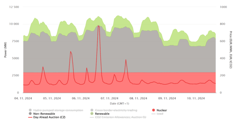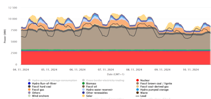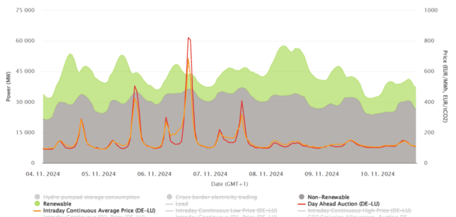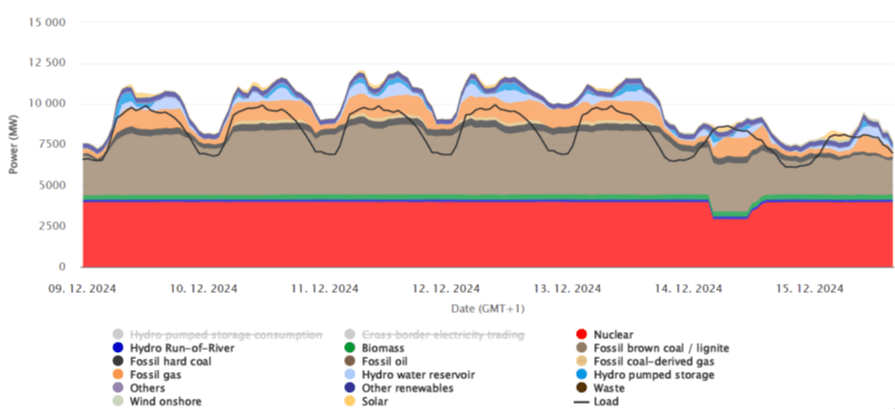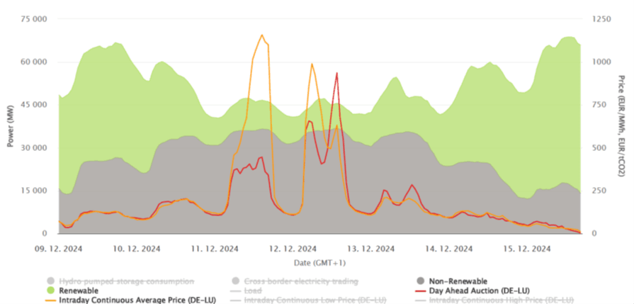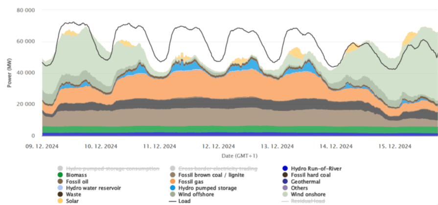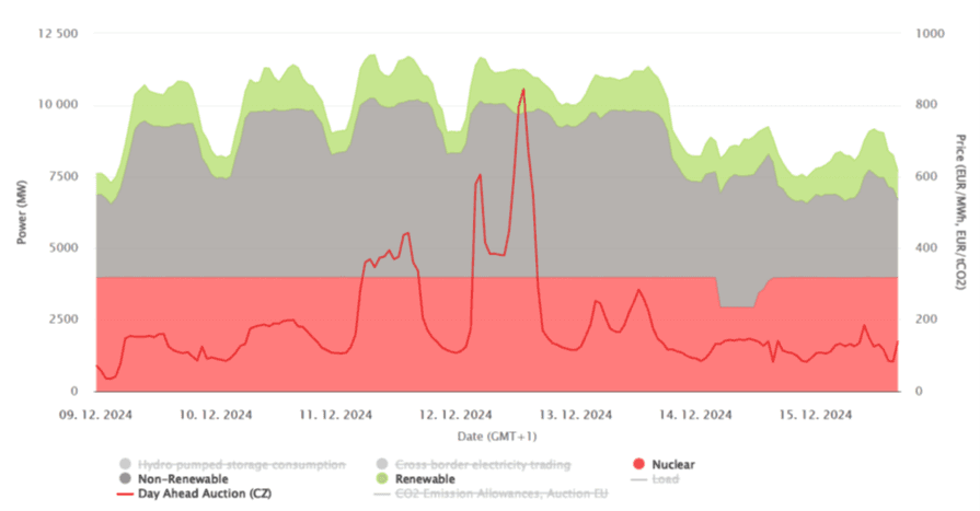 Naopak pak v zimě, v době, kdy nastoupí zmíněná dunkelflaute, nedodají větrné a fotovoltaické zdroje téměř nic. V takové době, které jsme byli svědky mezi 4. až 16. listopadem a mezi 10. až 15. prosincem, pak Německo spustí všechny své fosilní zdroje, včetně těch na mazut, a i tak dováží až přes 10 GW výkonu od svých sousedů. Dramaticky tak u nich zvyšuje cenu na spotovém trhu. Ta pak v blízkosti Německa může dosahovat hodnot až 900 EUR/MWh, jak jsme toho byli svědky třeba 12. prosince 2024. Německo tak své extrémní ceny na spotovém trhu vyváží do okolních států, ze kterých elektřinu dováží. Proti tomu se již severské státy, například Švédsko a Norsko, velmi silně nedávno ohradily.