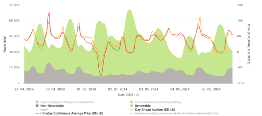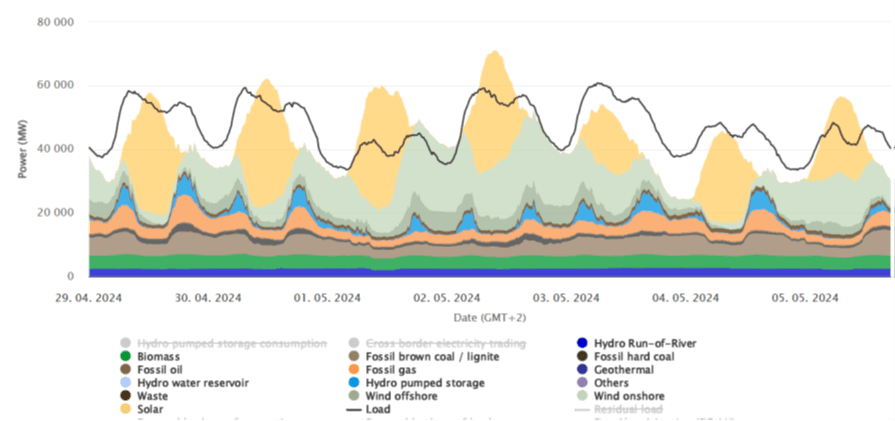Připomeňme, že v německá spotřeba v maximu přes 70 GW a v extrému se může přiblížit i 80 GW, obvykle se však pohybuje mezi 50 až zmíněnými 70 GW. V zimě je spotřeba o něco vyšší, a hlavně maxima jsou větší. Ovšem Německo má na rozdíl od Francie minimální část vytápění s využitím elektřiny. Je tak vidět, že nominální výkon fotovoltaiky i větrníků překračuje potřeby. Pokud jsou ideální podmínky pro oba zdroje zároveň, je překročení potřebného výkonu až násobné. Je pravda, že ne všechny fotovoltaické zdroje jsou zamířeny stejným směrem a mají maximum výkonu ve stejnou dobu, i větrné zdroje ne všechny jsou na nominálním výkonu ve stejnou dobu. I tak už jsou však období, kdy má Německo obrovské přebytky elektřiny z větru a slunce, neví kam s nimi a způsobuje záporné ceny na okamžitém trhu u sebe i sousedů.
