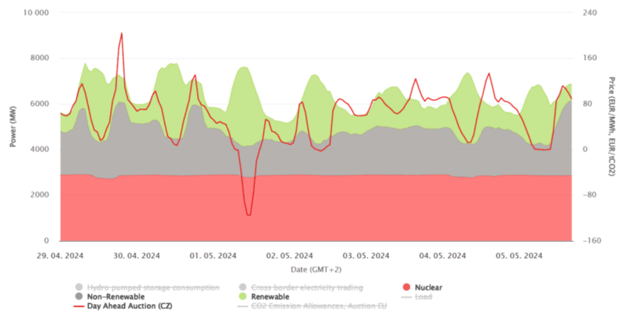Záporné ceny mohou vznikat tím, že v řadě případů lze jen těžko úplně vypnout fosilní elektrárny, které musí být v horké záloze, až se počasí zhorší, a ideální podmínky pro obnovitelné zdroje trvají jen omezenou dobu. Stejně tak se nedají snadno vypínat a spouštět jaderné bloky. V současné době jsou však hlavním zdrojem záporných cen elektřiny na spotovém trhu provozní dotace obnovitelným zdrojům. Fotovoltaické i větrné zdroje lze jednoduše v případě potřeby vypnout. Pokud je však u nich dotovaná cena 100 EUR/MWh, vyplatí se jim provoz i při záporné ceně -90 EUR/MWh.