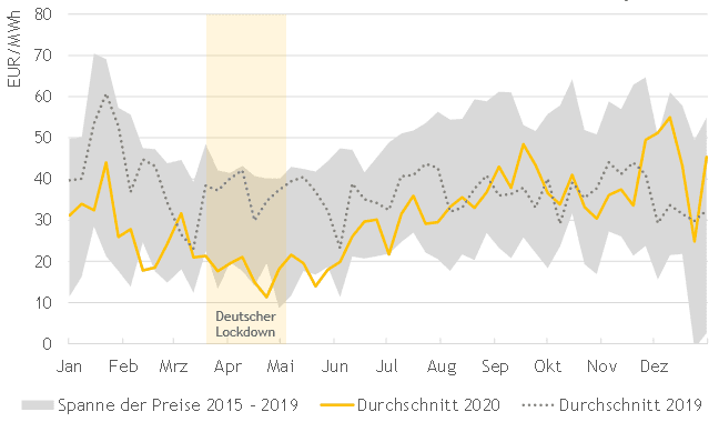 Průměrná cena silové elektřiny na velkoobchodním trhu v Německu v loňském roce dosáhla 30,47 EUR/MWh, což je o 7 EUR/MWh nebo o 19 % méně než v roce 2019. Svého minima cena dosáhla v dubnu, kdy se Německo nacházelo ve svém prvním lockdownu.