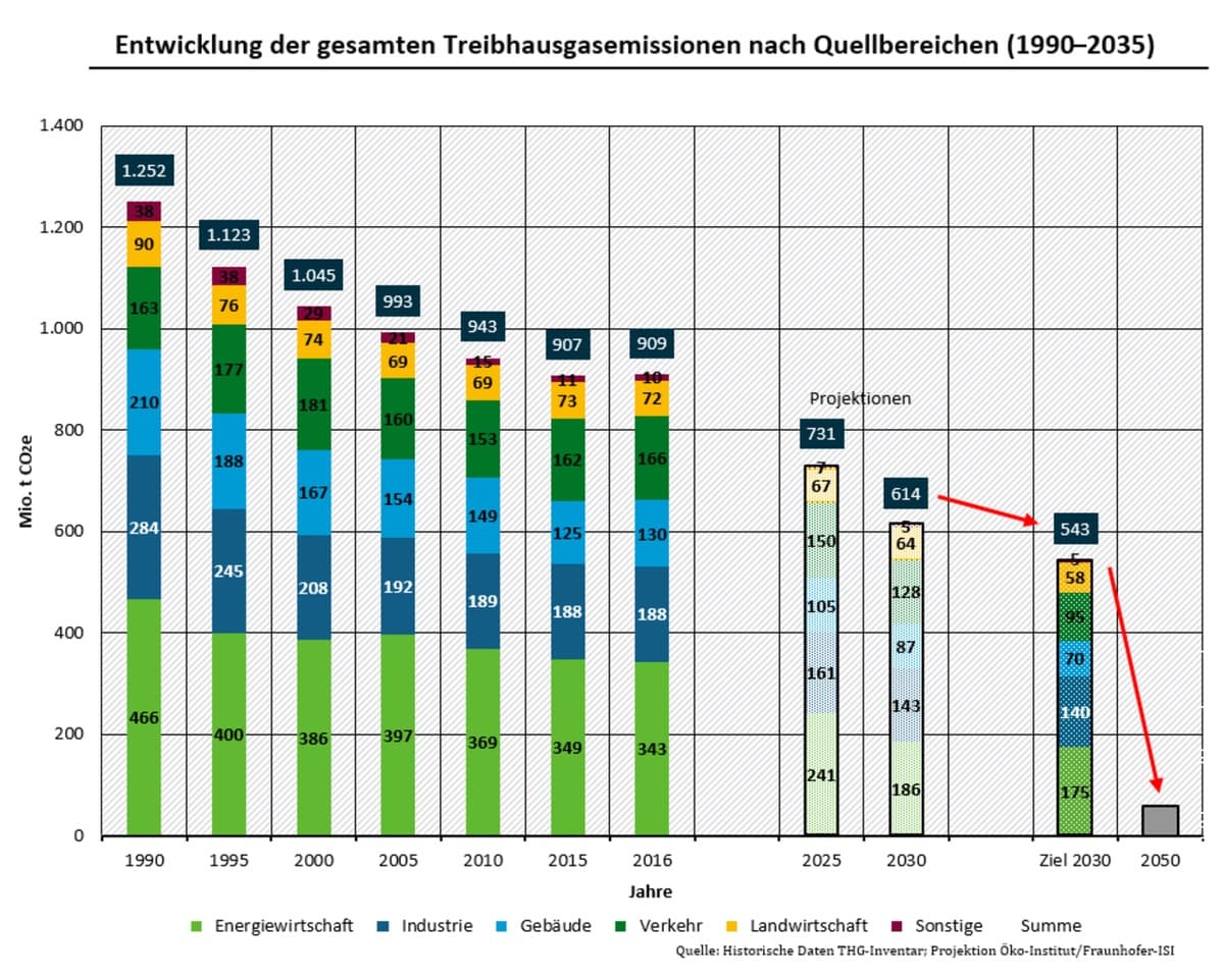 I přes politicky urychlené uzavírání uhelných elektráren, zavedení systému obchodování s emisemi v oblasti dopravy a budov a řadě dalších opatření nebude dosaženo cíle pro rok 2030, snížit emise skleníkových plynů (GHG) o 55 % oproti hodnotám roku 1990, a vypustit tak maximálně 543 mil. tun ekvivalentu CO2 (CO2e) do ovzduší. V roce 2018 přitom Německo vypustilo 858 mil. t CO2e.