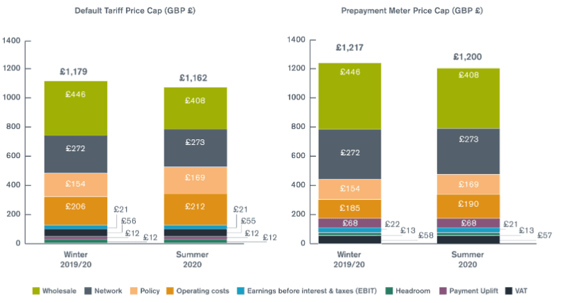 Nejvýznamnější vliv na pokles cenového limitu mělo snížení velkoobchodních cen elektřiny a plynu ve vyhodnocovaném období (srpen 2019 až leden 2020). K nižším cenám vedly především nízké ceny zemního plynu, kterého je na trhu dostatek díky rekordním hodnotám dovozu LNG a vysokým zásobám v podzemních zásobnících. Složka velkoobchodních cen, která při výpočtu limitu hraje významnou roli, poklesla o 38 GBP. Cenový nárůst byl naopak zaznamenán v oblastech provozních nákladů, síťových a ekologických poplatků a poplatků za zavádění „chytrých“ měřidel.