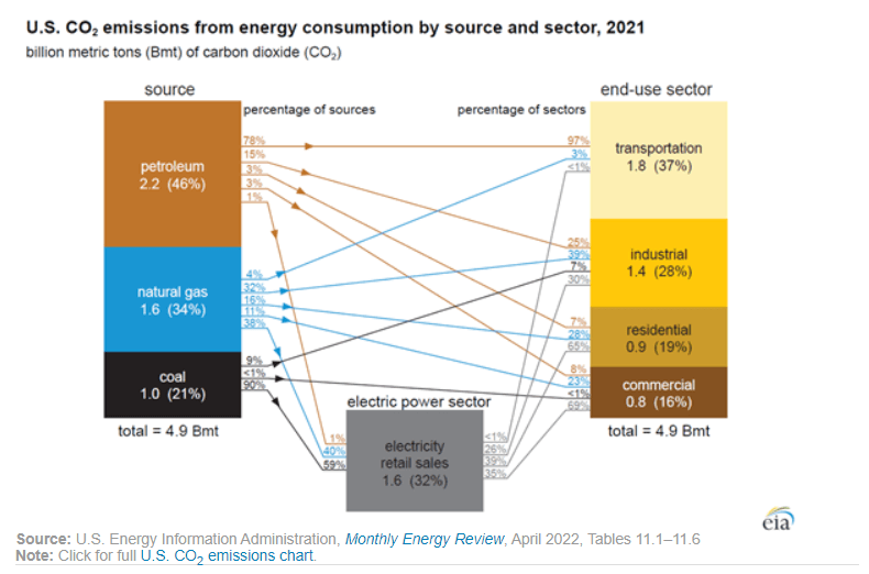Podle dat americké vládní agentury U.S. Energy Information Administration (EIA) v roce 2021 emise CO2 ze sektoru energetiky v USA vzrostly o 296 milionů tun. Ve srovnání s předchozím rokem to představuje 6% nárůst. K nárůstu došlo v důsledku zvýšené ekonomické aktivity související s polevováním pandemie koronaviru. Meziročně sice k došlo nárůstu emisí, v roce 2021 bylo přesto emitováno méně CO2 než před pandemií v roce 2019.