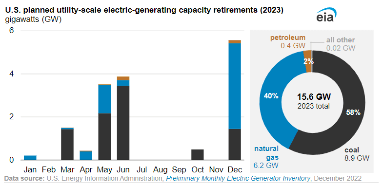 Provozovatelé plánují v roce 2023 ukončit provoz 15,6 GW instalovaného výkonu elektráren v USA. 98 % z tohoto výkonu budou elektrárny na uhlí nebo zemní plyn. Tyto uhelné i plynové elektrárny jsou odstavovány kvůli svému stáří a nízké efektivitě. Plynových elektráren ale má být v roce 2023 zprovozněno více než odstaveno. Informovala o tom vládní agentura Energy Information Administration (EIA).