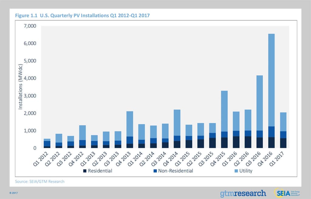 Letošní první kvartál je už šestým kvartálem v řadě, během kterého bylo v USA vybudováno více jak 1 GW velkých solárních elektráren, a celkový instalovaný výkon solárních elektráren byl navýšen o více jak 2 GW. Navíc se očekává, že trh se solárními panely v rezidenčním i nerezidenčním sektoru má dále růst. A to i přes to, že čtvrtletní čísla oproti minulému roku poklesla.