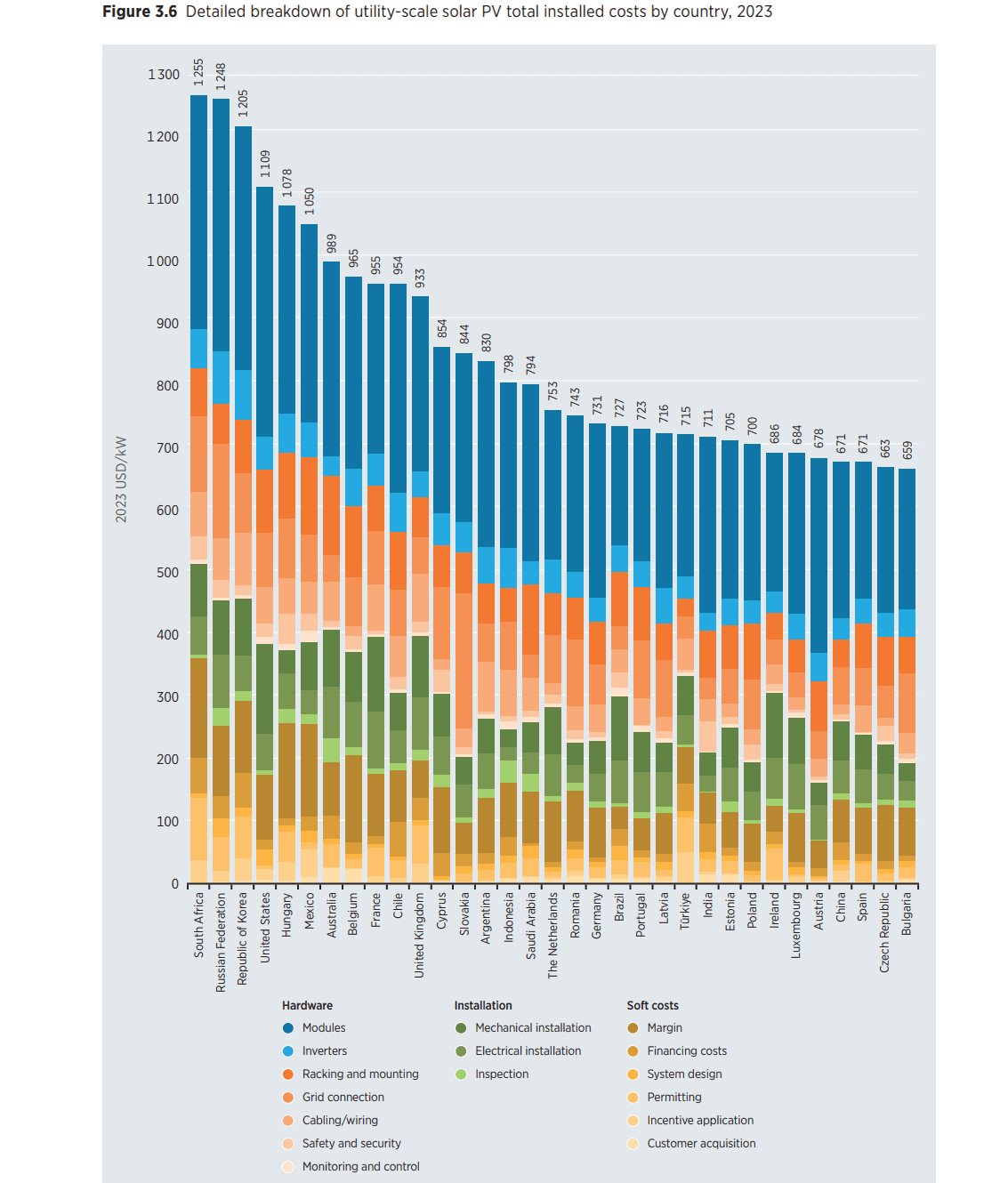 Náklady na výstavbu 1 kW instalovaného výkonu v České republice IRENA odhadla na 663 USD. Pouze Bulharsko má uvedeny náklady o něco málo nižší.