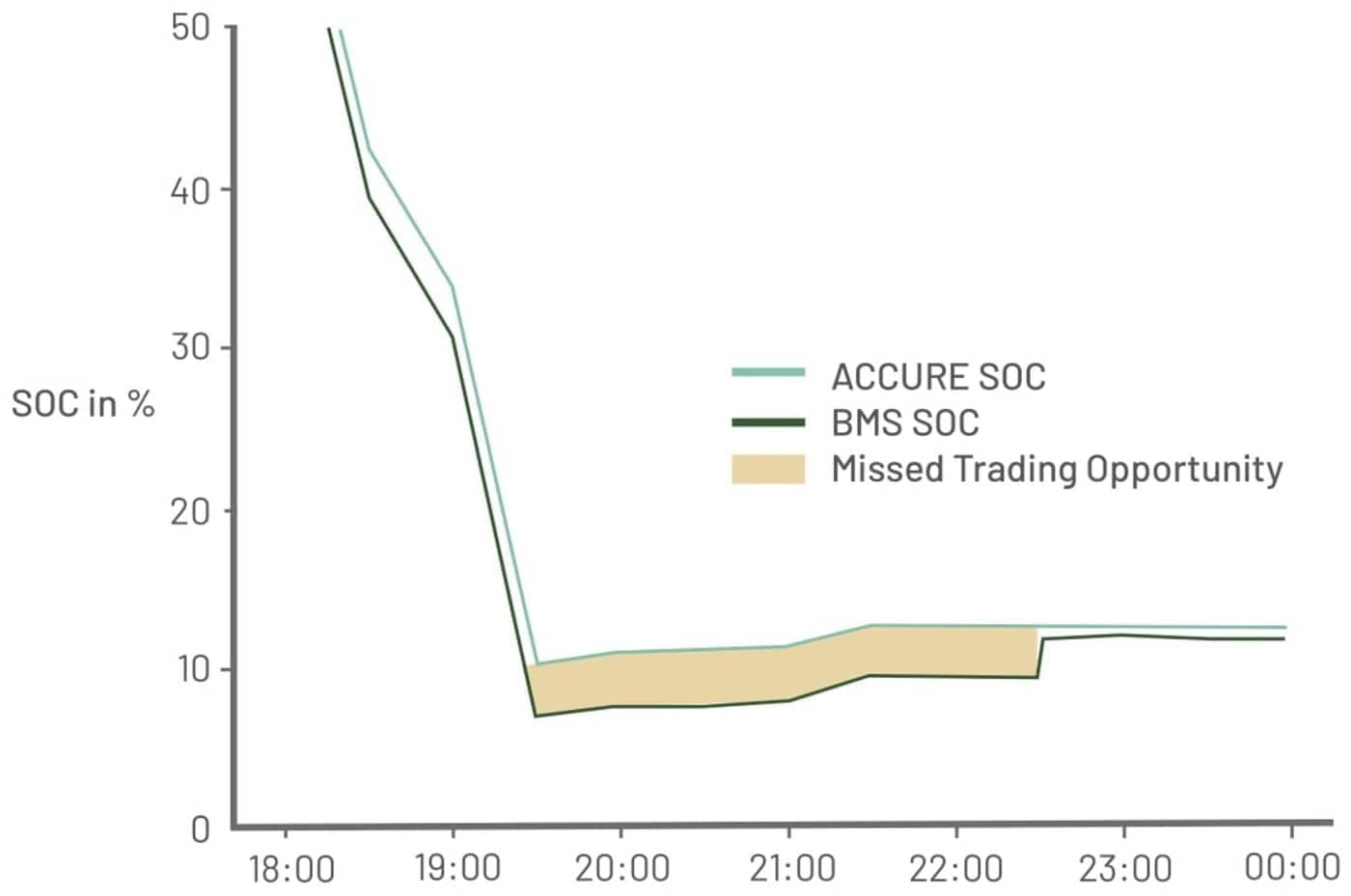 Nedávná analýza odvětví provedená společnosti ACCURE zjistila, že 20% chyba v odhadu stavu nabití (SOC) může vést ke ztrátám příjmů až 11 % pro investory do BESS. Tento jev při obchodování na trhu proto investorům působí značnou míru nejistotu.