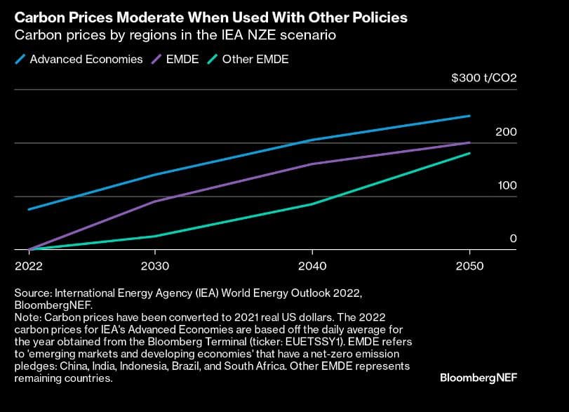 Do roku 2050 se cena, kterou budou muset „rozvinuté ekonomiky“ platit, zvýší na 250 USD/t CO2, zatímco úroveň ceny je nižší pro rozvíjející se ekonomiky a osciluje kolem 180 USD/t CO2. Předpokládá se, že tyto regiony budou prosazovat přímější politické přístupy k dekarbonizaci svých energetických systémů. Pro kontext BloombergNEF očekává, že ceny emisí uhlíku v EU ETS budou v roce 2030 kolem 170 USD/t CO2, což je mírně nad hranicí 140 USD/t CO2 stanovenou IEA pro stejný rok.