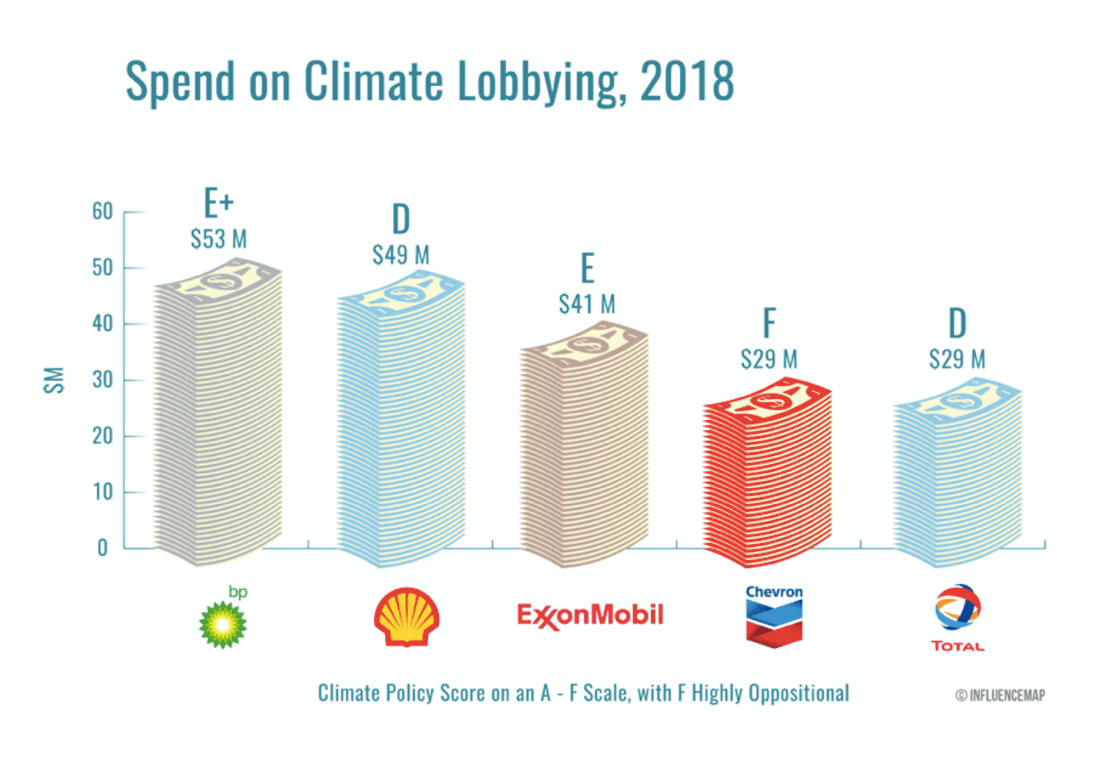 Mezi společnosti, které za anti-klimatické lobby vydají největší sumy, se zařadila britská BP, nizozemská Shell či americká ExxonMobil. Zpráva InfluenceMap odhaluje, že za tři roky od podepsání Pařížské klimatické dohody investovaly největší ropné firmy asi 1 miliardu USD do zpravodajství se zavádějícím obsahem a lobbování (zpráva mimo výše uvedené jmenuje i společnosti Chevron a Total).
