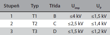 Třetím stupněm „T3“ (D) se zajistí ochrana velice citlivých spotřebičů. Tato jemná ochrana zaručuje, že přepěťová hladina nepřesáhne 1,5 kV. Reaguje totiž na přepětí ze všech tří stupňů nejrychleji. Následující tabulka udává hodnoty impulzních výdržných napětí Uimp definovaných normou a hodnoty napěťových ochranných hladin Up při použití přepěťových ochran OEZ. Pro přehlednost je zde uvedena klasifikace přepěťových ochran dle ČSN EN 61643-11 (T1, T2 a T3) a dříve používaná klasifikace dle VDE 0675-6 (B, C a D).