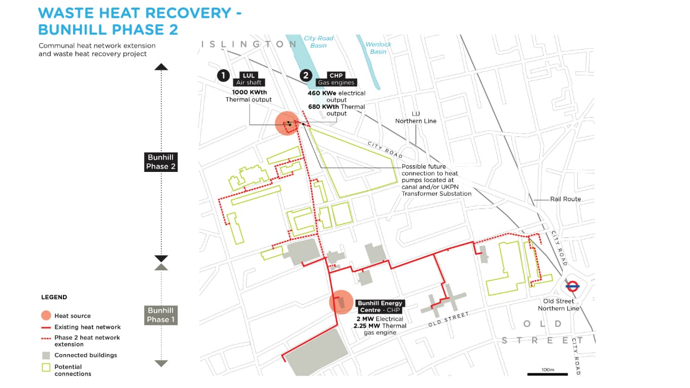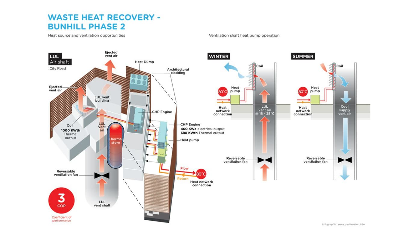 V londýnském městském obvodě Islington vzniká inovativní projekt (Bunhill), který využívá odpadního tepla z provozu londýnského metra k ohřevu okolních budov. Londýnská Northern Line, která je světově nejstarší tratí hloubeného metra, si tak může připsat další zajímavost. Cestující ocení nižší teploty v často přehřátém metru, kdežto odběratelé v blízkém okolí mají přístup k nízkoemisnímu a levnému zdroji vytápění.