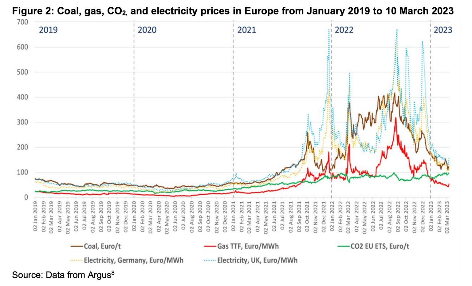 Ceny energetických komodit postupně klesají. Od 10. března 2023 poklesly ještě razantněji a přidala se také emisní povolenka. Zdroj: Oxford institute for energy studies, Argus