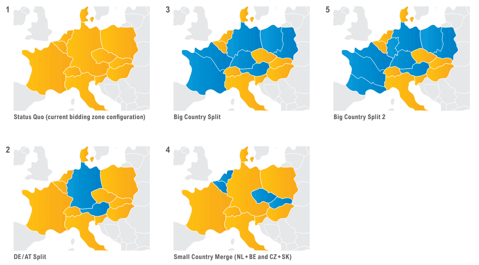 Scénáře, které rozdělují stávající obchodní zóny, sestávají z oddělení Rakouska a Německa, rozdělení „velkých zemí“ – Francie, Německa a Polska a další rozdělení Francie a Německa do tří zón. Druhé pododdělení Francie a Německa / Lucemburska je výsledkem výslovné žádosti vnitrostátních regulačních orgánů v příslušném regionu. Pro vyhodnocení důsledků spojení zón byly zahrnuty kombinace obchodních zón Belgie s Nizozemskem a České republiky se Slovenskem. Zmíněné konfigurace byly porovnány s aktuální konfigurací obchodních zón (označované jako „status quo“).