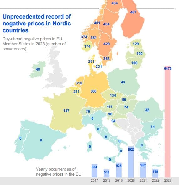 Rok 2023 byl rekordním z pohledu výskytu záporných cen elektřiny na jednotlivých trzích v zemích Evropské unie. Celkem jich podle analýzy Agentury Evropské unie pro spolupráci energetických regulačních orgánů (ACER) bylo zaznamenáno 6 470, což je více než trojnásobek ve srovnání s předchozím rekordním rokem 2020.