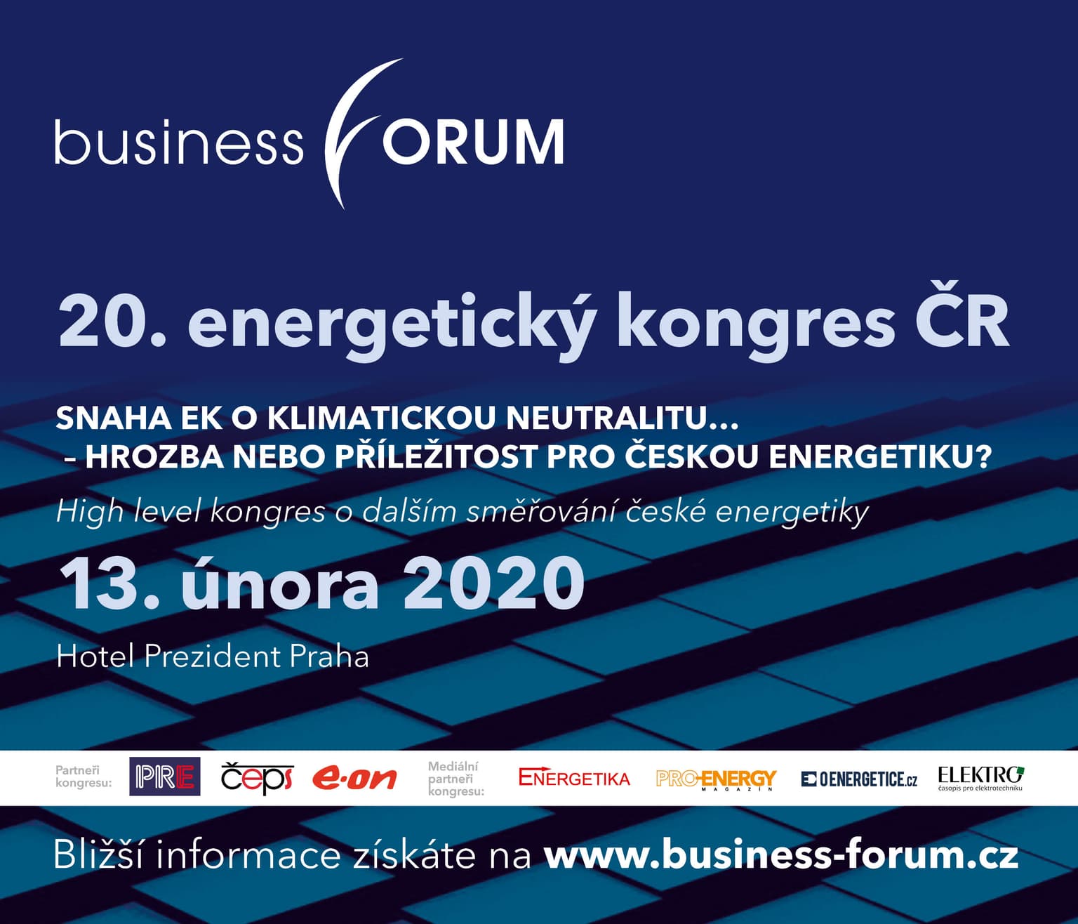 20. ročník prestižního energetického kongresu se uskuteční 13. února 2020 v hotelu Prezident v Praze. Tradičně se zde setkají vrcholoví manažeři a odborníci z nejvýznamnějších společností a institucí české energetiky.