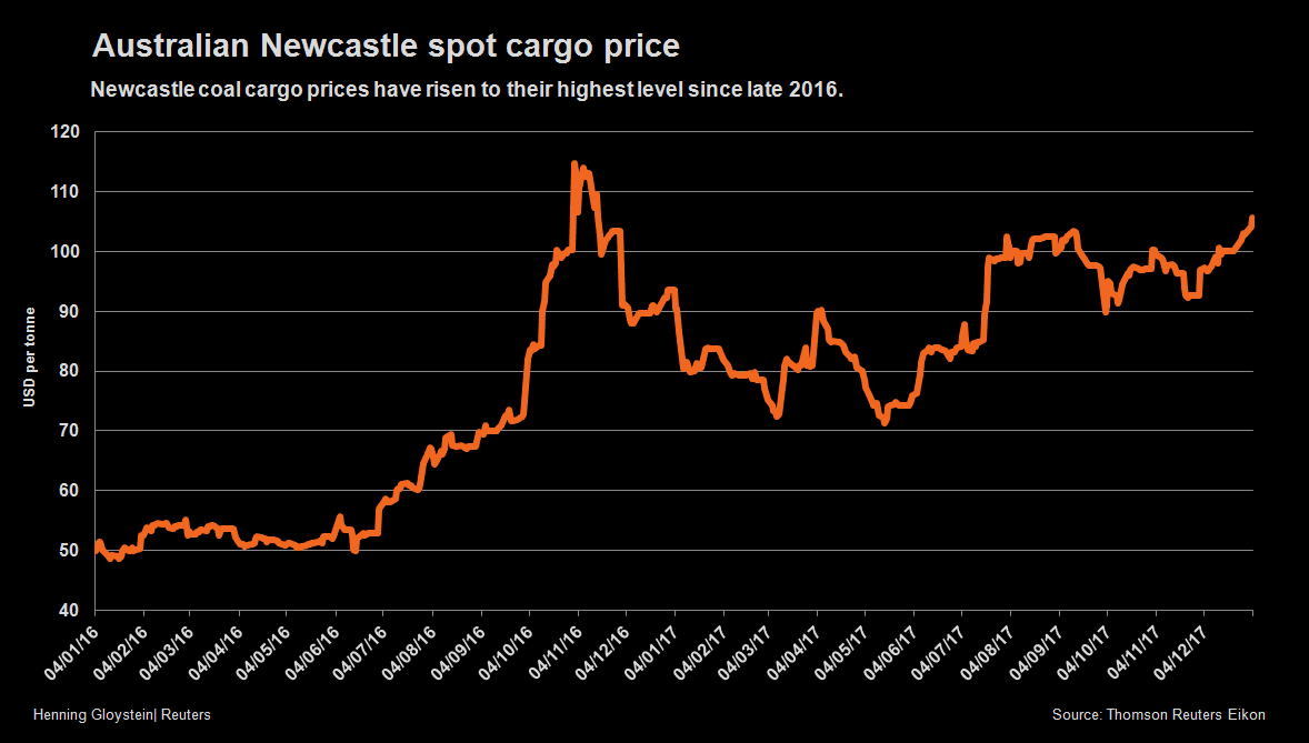 Benchmarkem pro cenu černého energetického uhlí na významném asijském trhu jsou ceny uhlí z australského přístavu v Newcastlu. Minulý týden v pátek byla jeho hodnota agenturou Argus ohodnocena na 103 USD za tunu, což je nejvyšší hodnota od listopadu 2016.