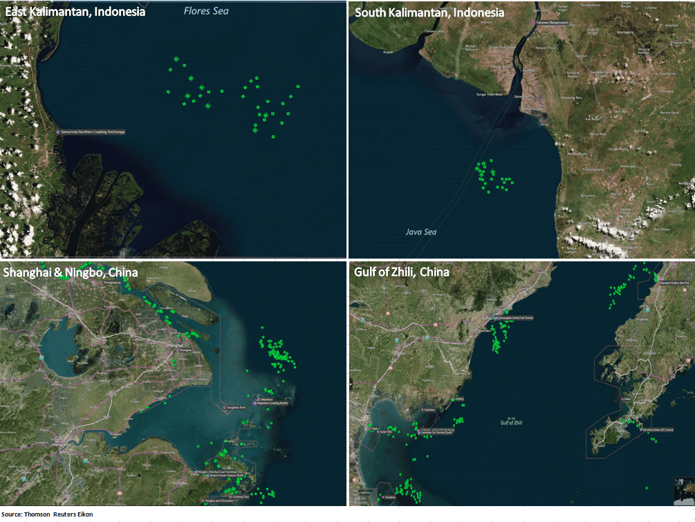 Zahlcení okolí přístavů začalo na konci roku 2017 a nadále se zhoršuje. Údaje Thomson Reuters ukazují, že přibližně 100 velkých přepravních lodí čeká na nakládku uhlí z pobřeží Kalimantanu v Indonésii, některé lodě zde čekají od konce října.