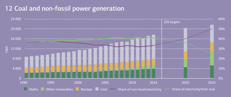 Projekt IEA sledující různé technologie, jež mohou přispět k dosažení 2°C scénáře do roku 2025, jehož výsledky byly zveřejněny v loňském roce na jaře, se vývoji v oblasti výroby elektřiny z uhlí také věnoval. Hlavním závěrem je nutnost, aby emise z uhelných elektráren klesaly o 3 % ročně až do roku 2025. Zároveň také zpráva zmiňuje, že by po roce 2020 výroba elektřiny z uhlí, jež nyní činí asi 40 % globální výroby elektřiny, měla začít klesat. Díky těmto krokům by pak 2°C scénáře mohlo být dosaženo.