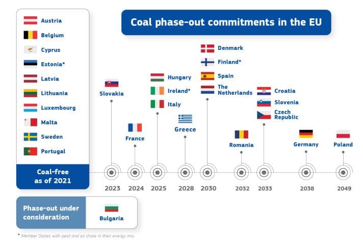 Evropská unie plánuje odklon od uhlí dlouhodobě, a přestože nemá konkrétní termín, kdy by k ukončení spalování uhlí mělo dojít, klimatické závazky unie si jej vyžádají zřejmě nejpozději do konce roku 2050. Do tohoto data má totiž Evropská unie dosáhnout klimatické neutrality.