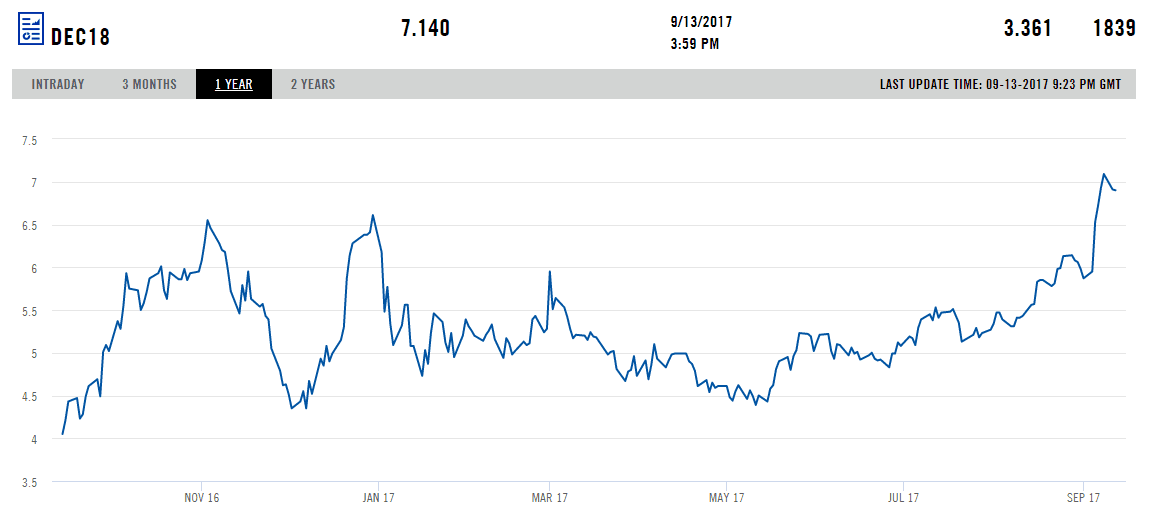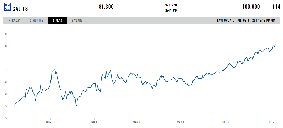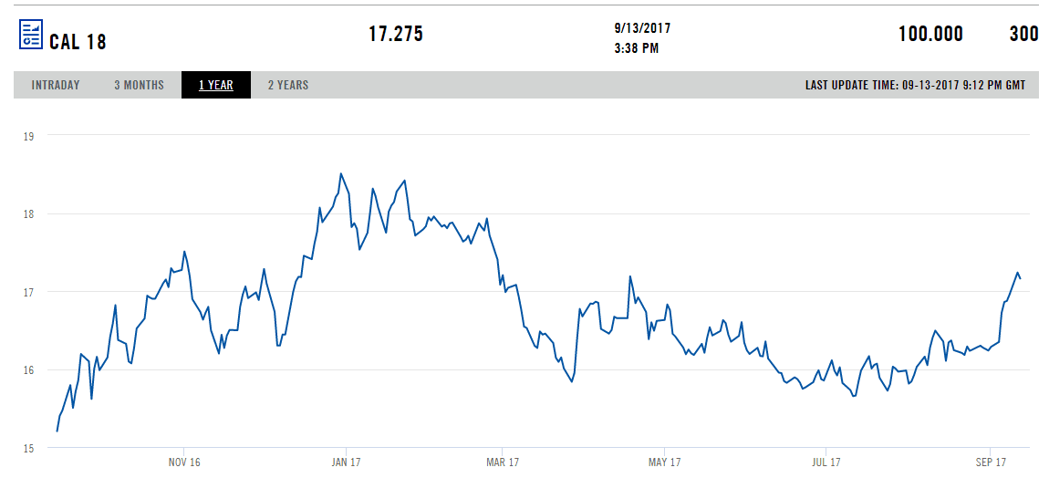 Cena elektřiny pro dodávku v Německu na kalendářní rok 2018 vzrostla od května o více než 20 % a v posledních dnech dosahovala rekordních hodnot, a to především v důsledku rostoucích cen uhlí a emisních povolenek, ale také kvůli obavám ze snížení dostupnosti výroby z francouzských jaderných elektráren a odstavením německého reaktoru Gundremmingen B do konce roku 2017.
