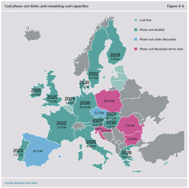 Výroba elektřiny z černého a hnědého uhlí meziročně klesla ve všech členských zemích EU (včetně Spojeného království). Celkem o 24 %. Jedná se o nejprudší pokles minimálně od roku 1990. Největší podíl na této změně mají Německo, Španělsko, Nizozemsko, Spojené království a Itálie, jež se na unijním poklesu výroby elektřiny z uhlí podílí z 80 %.