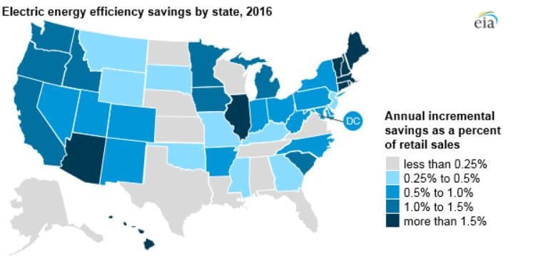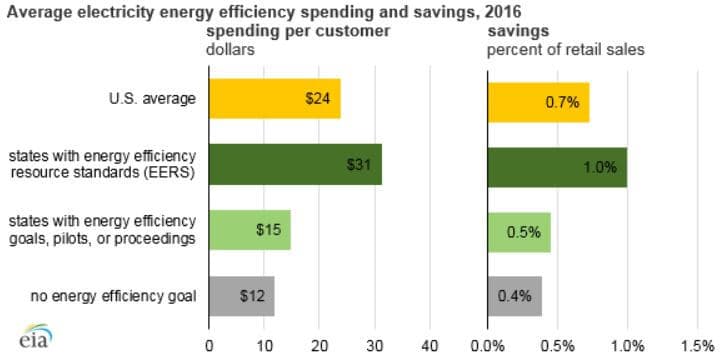 Ve státech s EERS byl průměrný výdaj v roce 2016 na odběratele 31 dolarů a prodej elektrické energie byl v průměru snížen o 1 %. Naopak utility ve státech s nezávaznými cíli měly průměrné výdaje 15 dolarů na odběratele a došlo ke snížení prodeje elektrické energie o 0,5 %. Utility ve státech s žádným programem na zvýšení energetické účinnosti vykázaly výdaje v průměru 12 dolarů na odběratele a státy v průměru snížily prodej elektrické energie o 0,4 %.