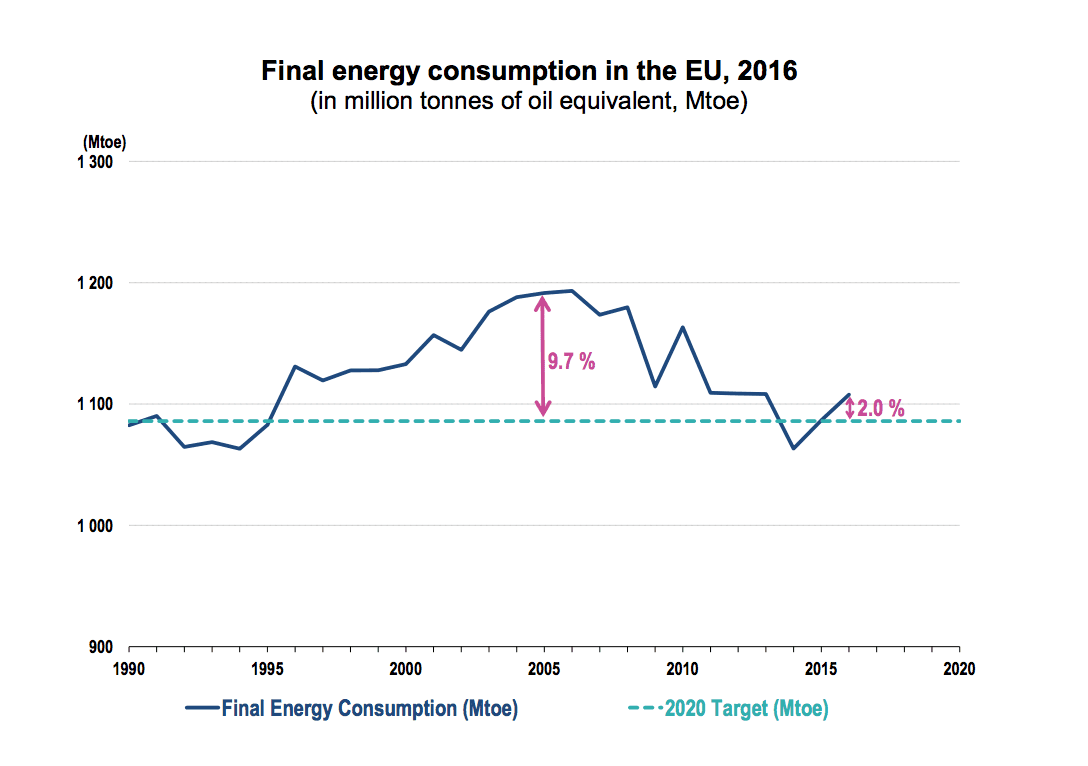 Spotřeba primární energie v Evropské unii byla v roce 2016 o 4 % nad cílem stanoveným pro rok 2020. Konečná spotřeba energie byla vyšší o 2 %. Oba ukazatele nicméně podléhají značným fluktuacím a i přes zřejmý trend není zřejmé, zda bude cíle dosaženo.