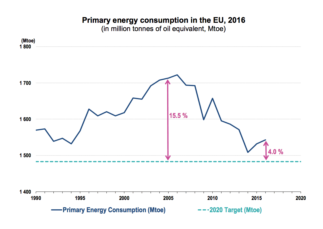 Přesto je z níže uvedeného grafu zřejmé, že od roku 2006, kdy dosahovala spotřeba primární energie ve státech EU 1723 Mtoe, je trend spotřeby primární energie klesající. V roce 2006 byla spotřeba primární energie nad cílem o více než 15 %.
