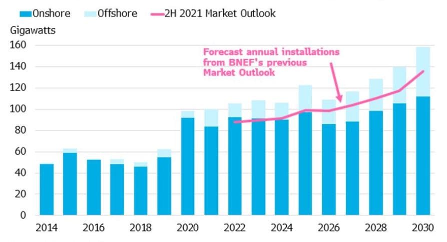 Analytici z BNEF odhadují, že díky ambiciózním dekarbonizačním plánům Číny a rychle rostoucímu sektoru offshore větrných elektráren bude do konce této dekády uvedeno každý rok do provozu více než 100 GW nového výkonu větrných elektráren.
