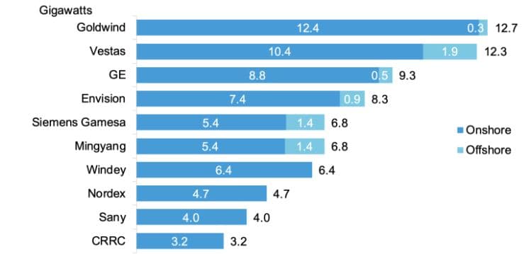 Goldwind podle BNEF dodal loni větrné turbíny o celkovém výkonu 12,7 GW, z čehož téměř 90 % mířilo na čínský trh. Druhým největším dodavatelem byl dánský Vestas s 12,3 GW a na třetím místě skončila americká společnost GE s 9,3 GW.