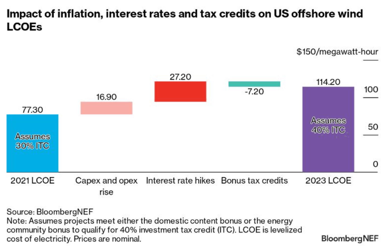 Nárůst investičních a provozních nákladů zvýšil sdruženou cenu energie o 16,90 USD/MWh. Vyšší náklady financování kvůli úrokovým sazbám zvýšily sdruženou cenu energie o dalších 27,20 USD/MWh.