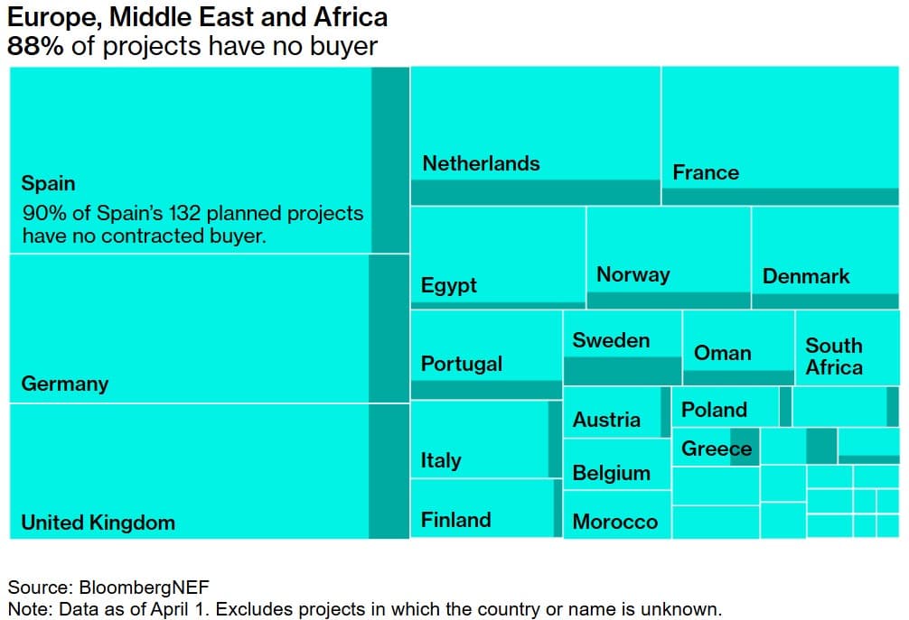 Nízkou poptávku po zeleném vodíku z elektrolyzérů reflektuje nízký počet vodíkových projektů, které mají předem smluvené odběratele. Podle analytiků BNEF nemá významná většina evropských projektů na výstavbu vodíkových elektrolyzérů zakontrahované odběratele vyrobeného vodíku. Celosvětově je to pak téměř 90 %.