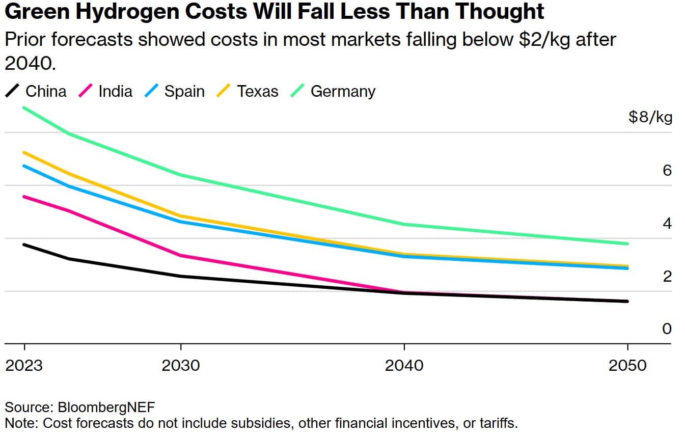 Bloomberg NEF (BNEF) revidoval své predikce a výrazně zvýšil odhadované LCOH (sdružené náklady na výrobu vodíku) pro zelený vodík v roce 2050. BNEF nyní odhaduje, že do roku 2050 může LCOH klesnout do rozmezí od 1,60 $ do 5,09 $ v závislosti na lokalitě výroby, což je trojnásobně více oproti předchozím predikcím.