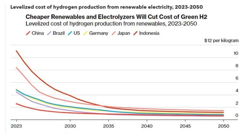 Plné náklady na výrobu vodíku v roce 2023 mírně vzrostly kvůli inflaci a vyšším nákladům na financování. Podle výzkumníků z BloombergNEF (BNEF) nicméně stále platí, že se zelený vodík z nových výroben stane na pěti trzích konkurenceschopným s šedým vodíkem vyrobeným ve stávajících výrobnách.