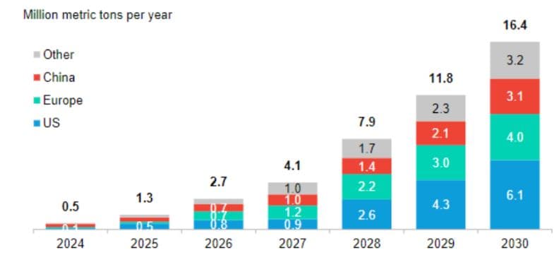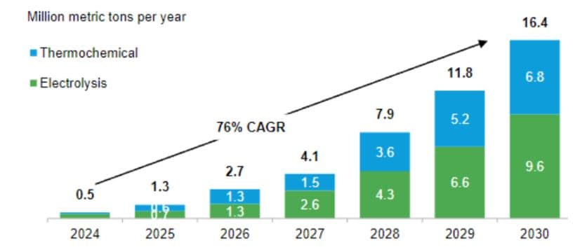 Výzkumníci z BNEF očekávají prudký růst výroby nízkoemisního vodíku do roku 2030, a to ze současných zhruba 0,5 mil. tun/rok (zhruba 16,5 TWh) na více než 16 mil. tun/rok (zhruba 530 TWh). Současně však dodávají, že ani uvedený očekávaný růst nebude dostačující k naplnění cílů vlád jednotlivých zemí.