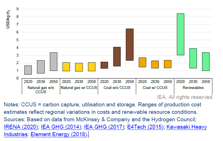 Náklady na výrobu tzv. zeleného vodíku elektřinou z obnovitelných zdrojů energie agentura odhaduje na 3–8 USD/kg. IEA ovšem očekává, že tyto náklady do roku 2030 poklesnou až na 1,3–3,5 USD/kg. Zelený vodík by se tak v některých případech mohl stát konkurenceschopný vůči modrému vodíku během necelé dekády.