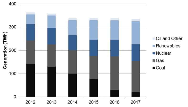 Pokrok v odklonu od fosilních paliv zůstává v Británii dále čitelný – podíl uhelných elektráren se dále snížil z 9 % v roce 2016 na 6,7 %, stejně jako výroba z elektráren plynových, která v roce 2017 činila 133 TWh (7% meziroční pokles). Vzhledem k nižší výrobě z tradičních zdrojů a vyšší výrobě zdrojů obnovitelných Spojené království zaznamenalo roční pokles emisí skleníkových plynů o 3 procenta.