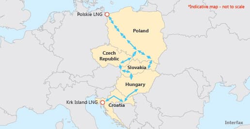 Na druhé straně Evropy otevřelo Polsko v roce 2016 svůj první terminál pro LNG v přístavu Svinoústí v Baltském moři. Polsko a Chorvatsko podepsaly dohodu o vybudování spojení severovýchodního plynovodu, který by měl být dokončen za dva až tři roky. Měl by umožnit proudění plynu mezi oběma terminály.