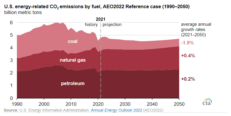 Přestože EIA výhledově očekává pokles spotřeby uhlí v USA, kvůli předpokládané rostoucí spotřebě ropy a zemního plynu budou emise CO2 po roce 2037 opět růst až na 4,7 miliard tun v roce 2050, tedy o 2 % nad úrovní emisí z 2021. K nárůstu spotřeby energie dojde i přes pokračující pokles energetické náročnosti kvůli predikovanému ekonomickému růstu a nárůstu populace.