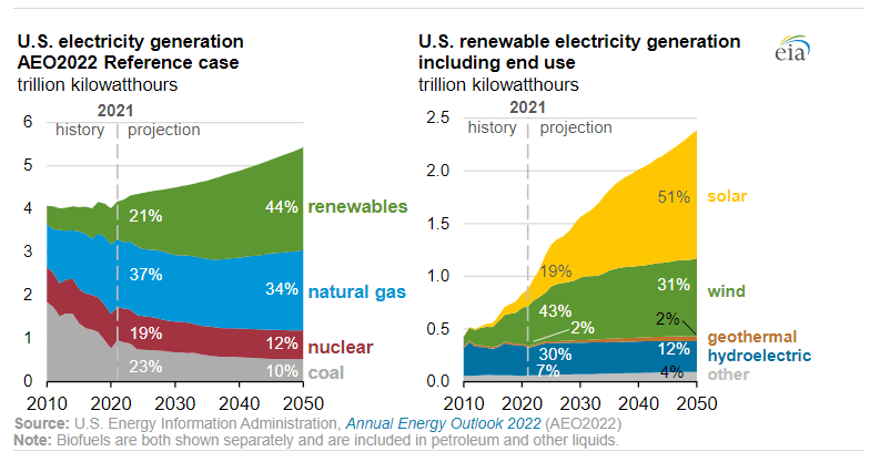 S výhledem emisí CO2 v energetickém sektoru souvisí také předpokládaný elektroenergetický mix USA do roku 2050. Referenční scénáře energetického výhledu EIA předpokládá, že podíl obnovitelných zdrojů energie na výrobě elektřiny v USA se zvýší z 21 % v roce 2021 na 44 % v 2050. K tomuto nárůstu dojde primárně díky rozvoji větrných a solárních elektráren. Výroba z vodních, geotermálních a dalších obnovitelných zdrojů energie se podle tohoto scénáře nezmění.