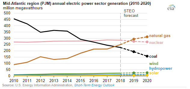 EIA nejen na základě těchto dat očekává, že v této oblasti USA se bude v roce 2020 vyrábět 39 % elektřiny ze zemního plynu (v 2018 to bylo 31 %) a 20 % z uhlí (28 % v 2018). V roce 2010 přitom tento region z uhlí vyráběl 54 % elektrické energie a z plynu pouze 11 %.