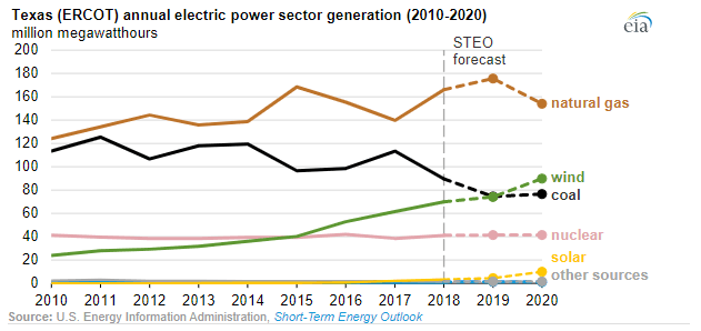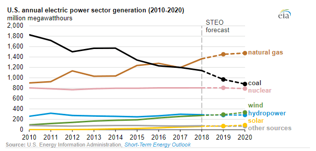EIA očekává, že v roce 2019 výroba elektrické energie ze zemního plynu vzroste o 6 % ve srovnání s uplynulým rokem a v roce 2020 o další 2 %. Podobně podle jejích dat vzroste i výroba elektřiny z větrné energie – konkrétně o 6 % v roce 2019 a o 14 % v roce 2020.