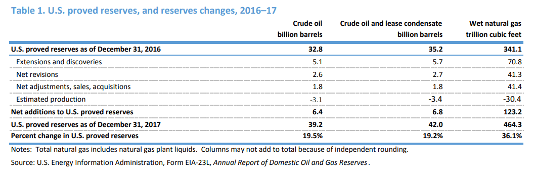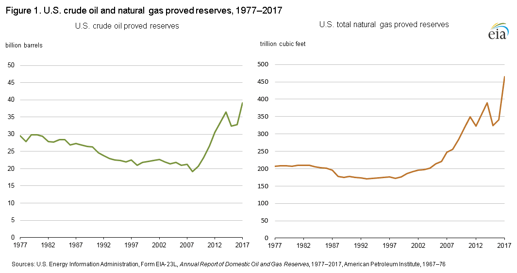 Vysoké ceny a pokračující rozvoj nekonvenčních zdrojů ropy i plynu v roce 2017 vyhnaly prokázané zásoby obou fosilních paliv v USA na nový rekord. Prokázané zásoby surové ropy dosáhly v roce 2017 39,2 miliard barelů a prokázané zásoby zemního plynu 464,3 bilionů krychlových stop. Velký podíl na růstu odhadů má zřejmě růst průměrných spotových cen ropy i plynu v loňském roce.