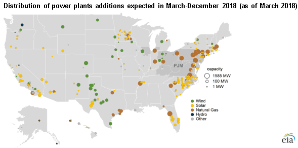 Polovinu výkonu z 21 GW, které EIA očekává, že budou v tomto roce připojené k přenosové soustavě, budou tvořit paroplynové elektrárny v přenosové soustavě spravované společností PJM, která zajišťuje přenos elektřiny ve 13 státech USA. Ve středo-atlantickém a středozápadním regionu PJM plánuje nainstalovat 5,2 GW v Pensylvánii a 1,9 GW v Marylandu a Virginii.