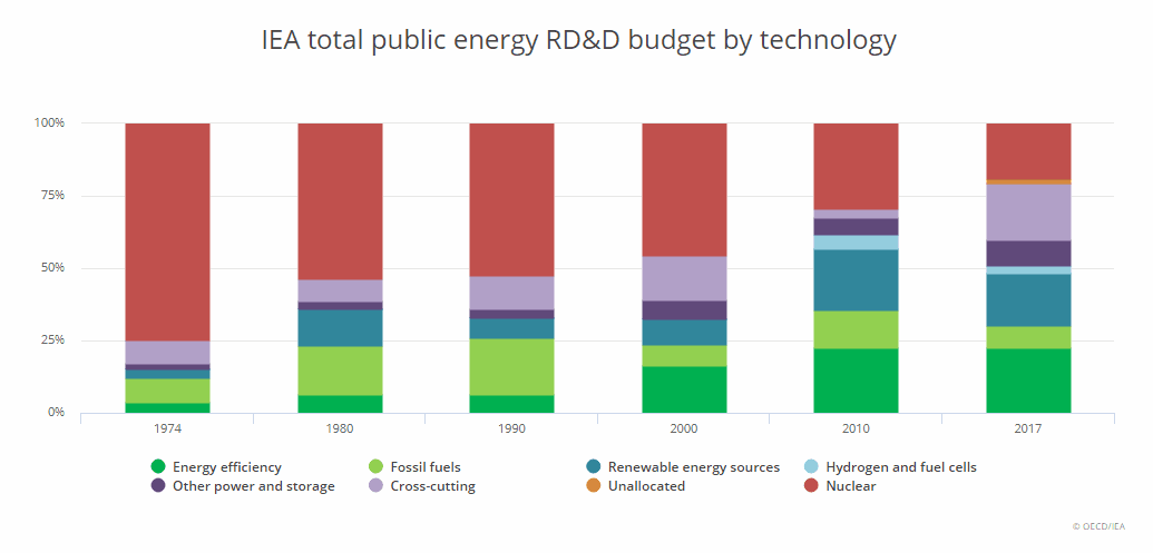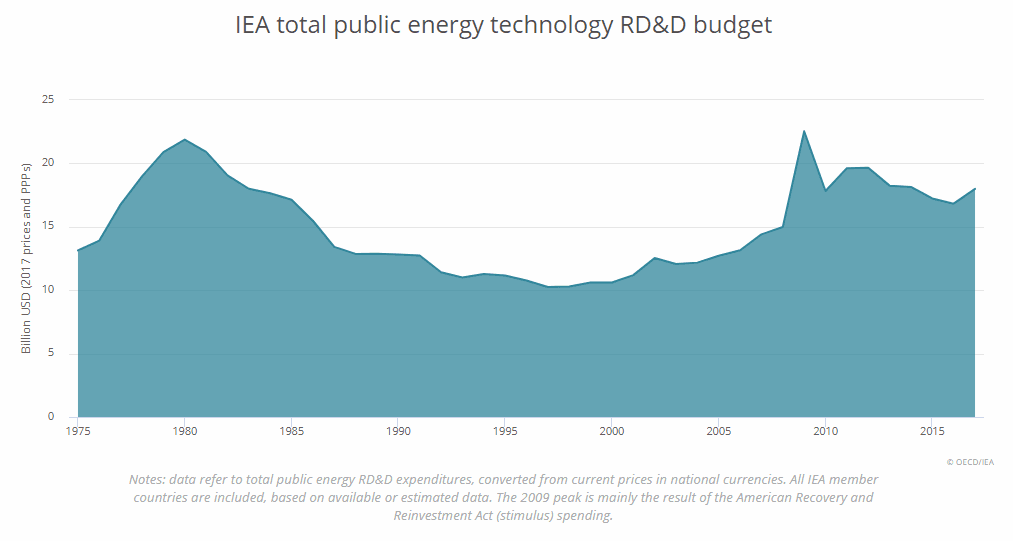 Celkový rozpočet na výzkum a vývoj technologií v energetice v členských zemích Mezinárodní energetické agentury činil v roce 2017 18 miliard USD (asi 408,7 miliard korun).