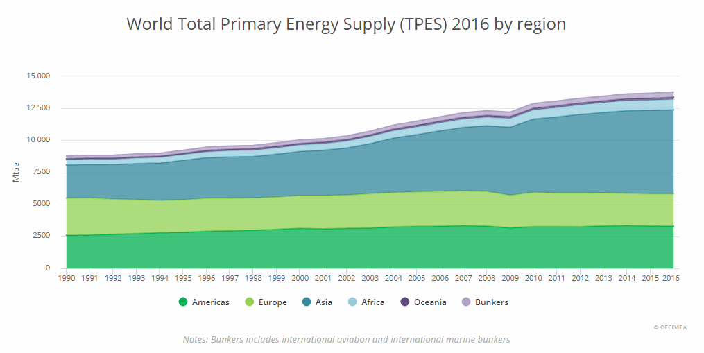 TPES v letech 1990 – 2016 po jednotlivých regionech. Zdroj: OECD/IEA