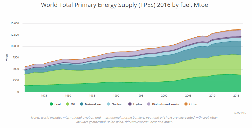 TPES na světě v letech 1971 – 2016. Zdroj: OECD/IEA