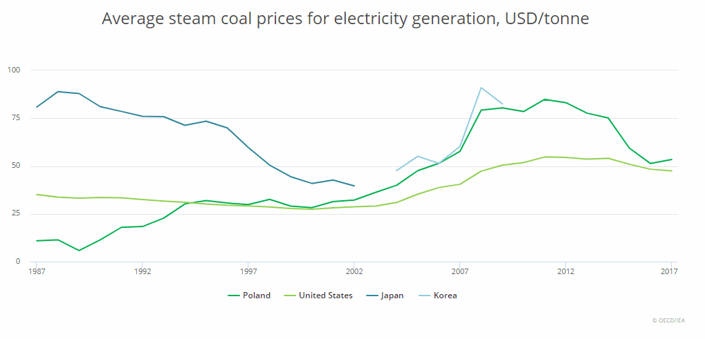Průměrné ceny uhlí používaného pro výrobu elektřiny. Zdroj: OECD/IEA